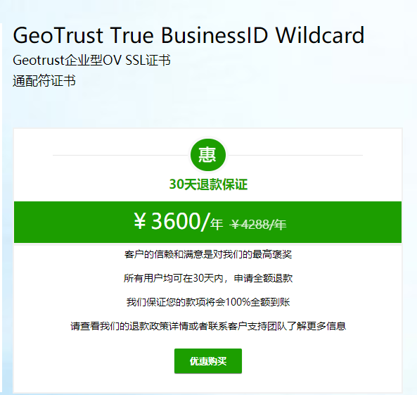 该款GeoTrust通配符证书可验证申请企业真实身份,可识别和防范钓鱼网站及流量劫持现象。申请一张GeoTrust通配符证书即可保护一个域名以及该域名的所有下一级子域名,没有数量限制。