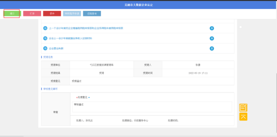 2、在受理环节,可以看到申请人全部信息和申请材料,点击材料即可进行预览;还可以进行信用核查,查看申请单位是否有失信信息